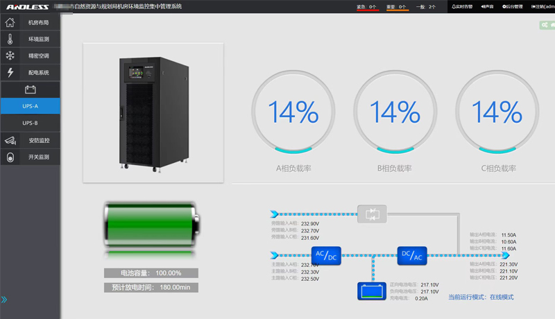 我司近期為安徽省某市自然資源和規劃局機房的UPS進行更換,本次更換了安德力士品牌模塊化UPS主機一臺(120KVA容量),并為其機房配置了一套動力環境監控系統,本套動力環境監控系統主要是對機房內的空調、門禁、監控進行監測。