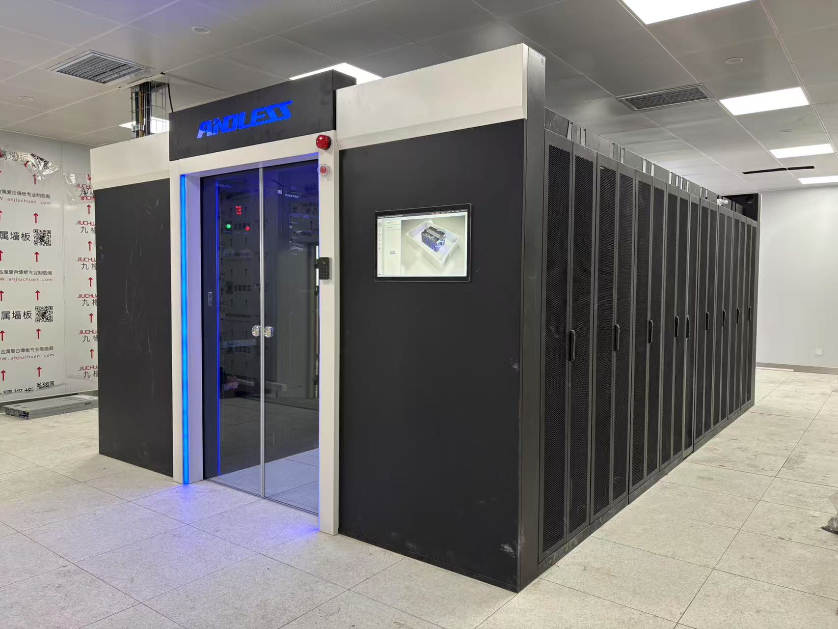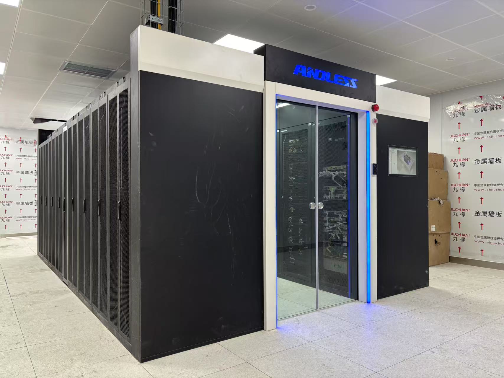近期有幸為濉溪職業(yè)技術學院機房提供安德力士品牌微模塊冷通道機房一套,該機房涉及系統(tǒng)有:UPS不間斷電源系統(tǒng)、機柜系統(tǒng)、封閉系統(tǒng)、行級精密空調(diào)系統(tǒng)、動環(huán)監(jiān)控系統(tǒng)等。
