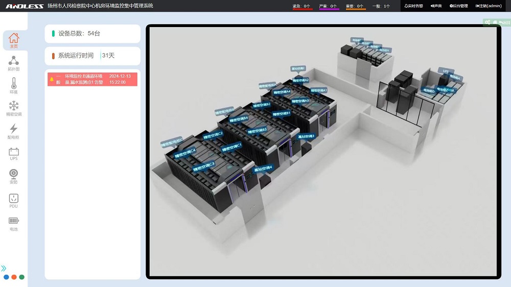 近期有幸為江蘇省某市檢察院提供三套安德力士品牌微模塊機房設備,涉及系統有:UPS不間斷電源、精密空調、機柜、配電、動力環境監控等系統;涉及主要設備有:UPS主機(30KVA、40KVA、300KVA)、鉛酸蓄電池(100AH64節、200AH128節、250AH320節)、精密空調(行級25KW12臺、基站12.5KW4臺)、機柜51套,現已全部安裝調試完成。