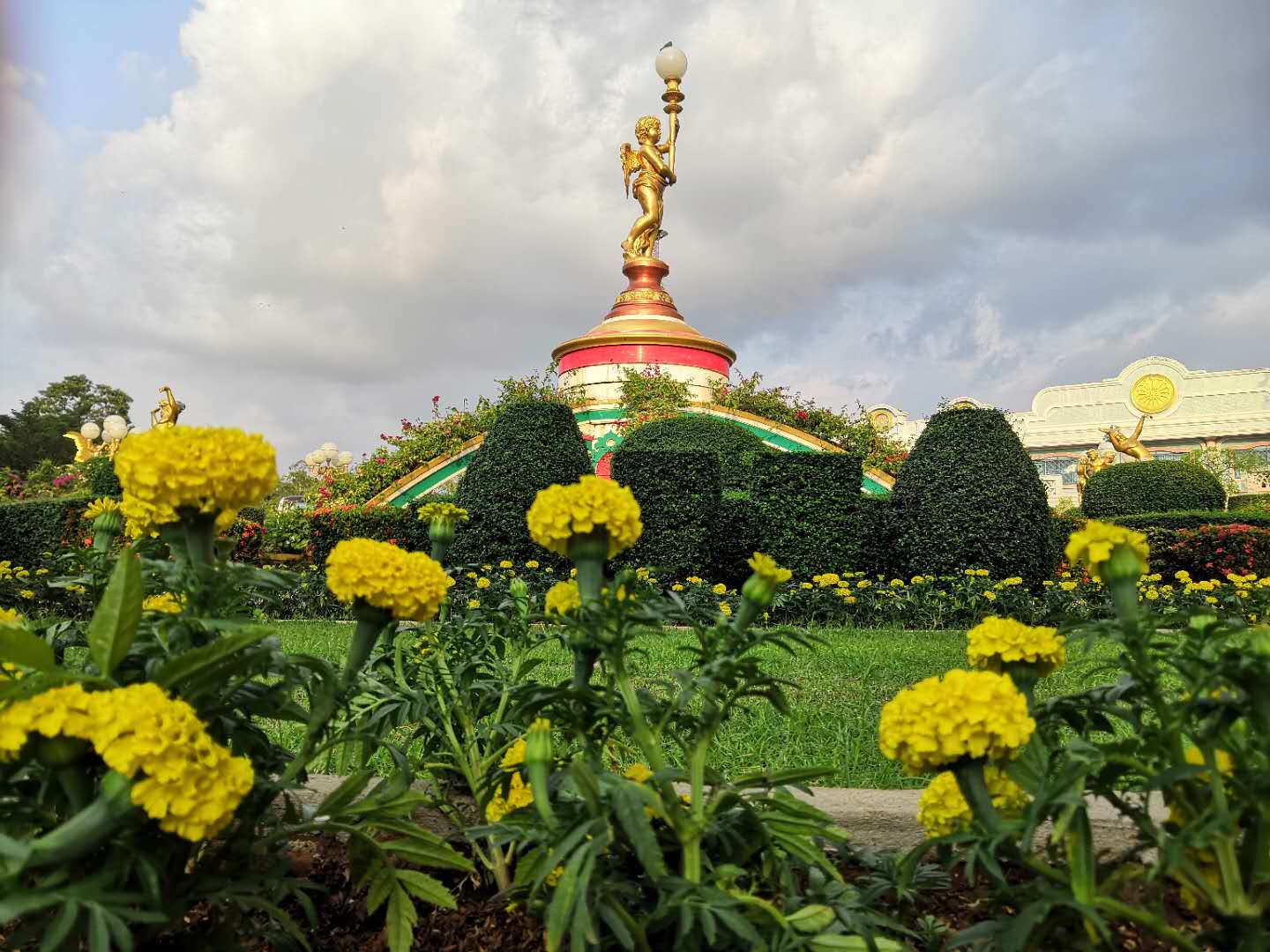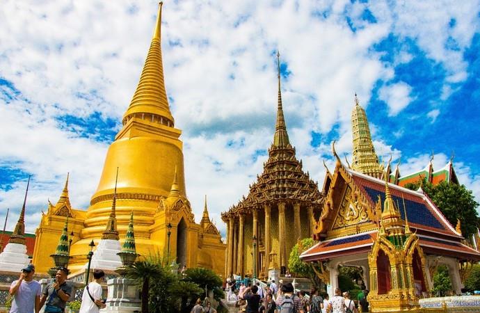 舉世聞名的大皇宮緊鄰著湄南河,是曼谷市中心內(nèi)一處大規(guī)模的古建筑群。走進(jìn)大皇宮庭院,首先映入眼簾的是如茵的大片草地和姿態(tài)各異的古樹,草坪周圍栽有一些菩提樹和其它熱帶樹木。大皇宮的佛塔式的尖頂直插云宵,魚鱗狀的玻璃瓦在陽光照射下,燦爛輝煌。尖角高聳的廟宇、佛塔,在陽光的照耀下,玲瓏剔透、金玉璀璨,雕功細(xì)膩、精致美觀的高大金漆佛像、石雕和繪有泰國傳統(tǒng)圖案的壁畫,記載著與王國和佛教有關(guān)的故事。