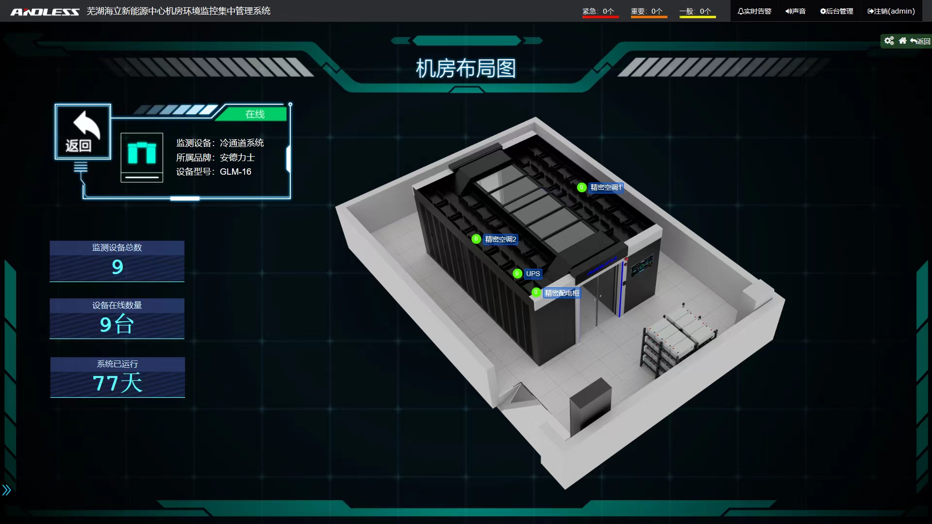 我司近期為蕪湖海立新能源技術有限公司提供安德力士品牌雙排微模塊機房一套(含UPS不間斷電源、機柜、精密配電、空氣調節、動力環境監控等系統設備),現已調試完成。